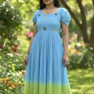 The Blue Coconut Mul Cotton Dress offers a sophisticated yet breezy look with exquisite handwork and a harmonious color blend—your go-to piece for effortless summer elegance.