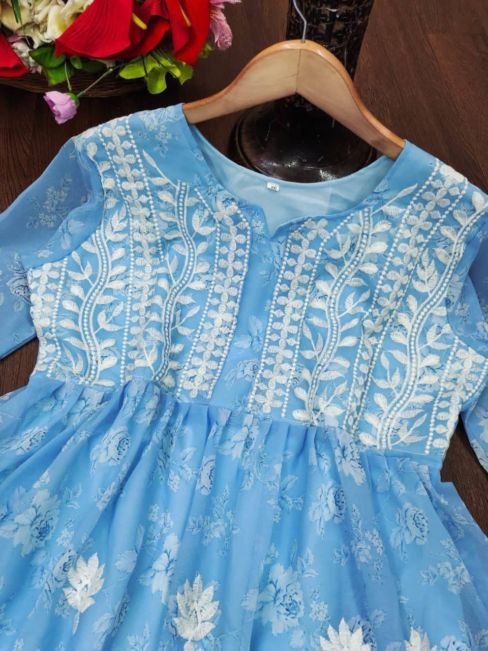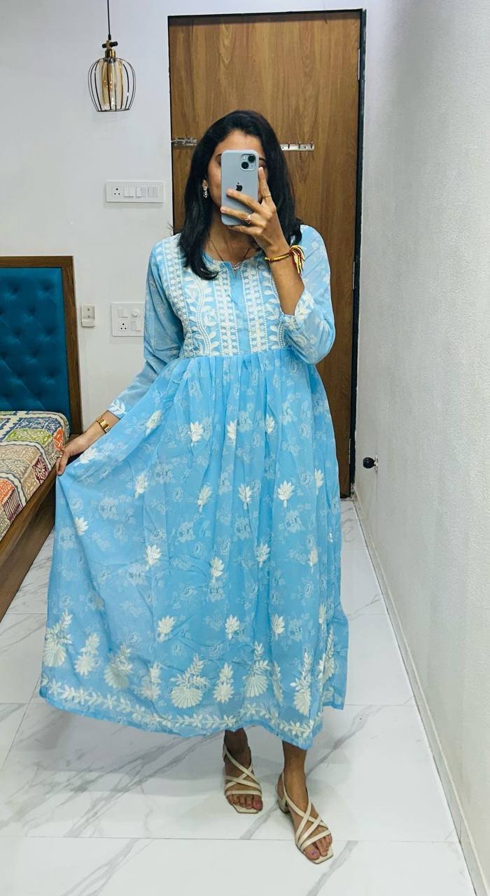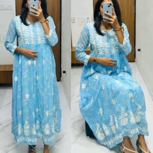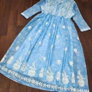Grace meets tradition in Lucknawi Chikankari Gown — a stunning georgette ensemble featuring delicate embroidery on printed fabric. Perfect for festive occasions, parties, and elegant everyday wear.