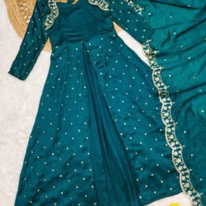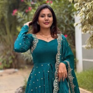 Turn heads in our Dark Green Anarkali Set, crafted from luxurious Vichitra Silk and adorned with finely detailed thread embroidery. Paired with a flowing dupatta, this ensemble is perfect for weddings, parties, and festive occasions. Sophistication meets style in every detail!