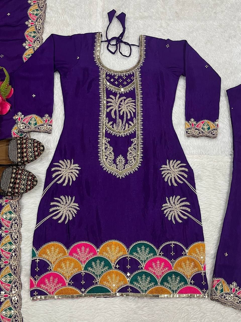 Step into luxury with our exclusive Designer Party Wear Set, crafted for elegance and style. Featuring a stunning heavy Chinnon Silk fabric with intricate 5mm sequence embroidery, this ensemble is perfect for making a bold statement at any occasion. The fully stitched top with elegant full sleeves and comfortable micro cotton inner offers both grace and comfort. Paired with matching embroidered pants and a sophisticated dupatta, this set is designed to turn heads.