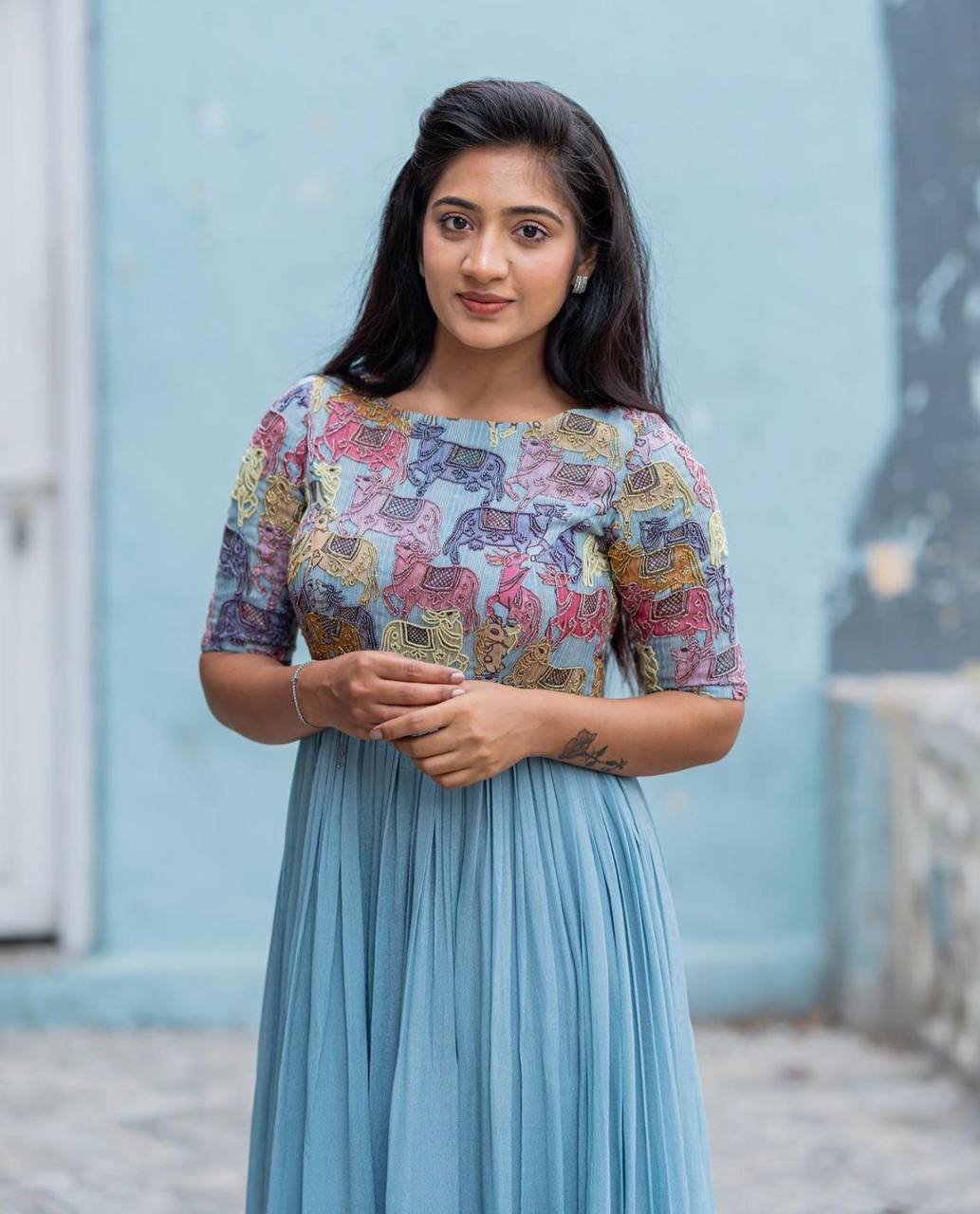 Unveiling its latest collection of real handwork gowns, designed to blend traditional craftsmanship with modern elegance. These gowns are made from high-quality Chinon fabric and are adorned with intricate handwork and Kalamkari prints that truly stand out. The fabric is soft, breathable, and ideal for any occasion, offering both beauty and comfort.