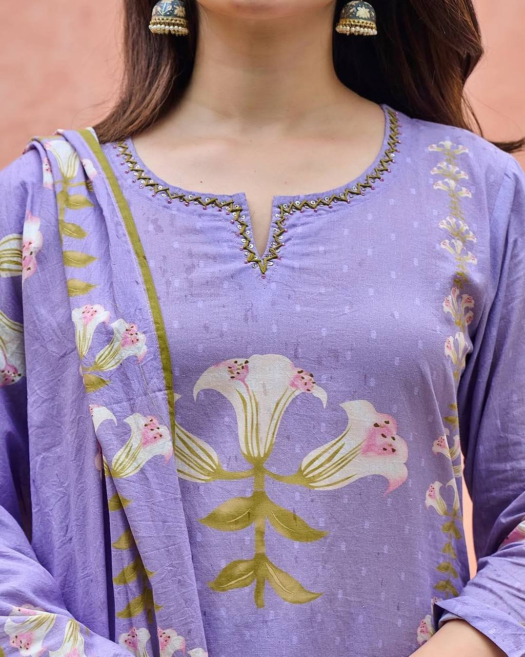 Embrace soft elegance with this Lavender Bloom Cotton Suit Set, featuring a refreshing floral print and delicate embroidery that enhances its charm. The cotton kurta is designed with a beautiful floral pattern and subtle hand embroidery along the neckline, giving it a refined ethnic touch.