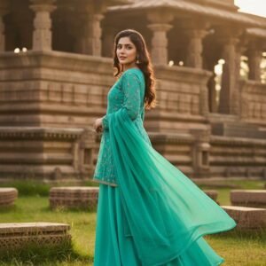 The dress features a sleeveless design, with a top length of 32″+ and a bottom length of 38″+, providing a flattering fit for all body types. The complete lining ensures comfort and durability, while the georgette dupatta with delicate lace detailing adds a touch of grace and sophistication. Whether you’re attending a party or a special gathering, this dress is sure to turn heads.
