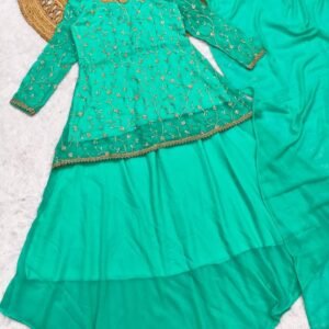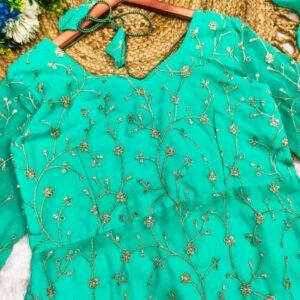 A beautiful Mint Georgette dress featuring all-over embroidery with thread and sequin detailing, complemented by a lace-bordered dupatta. Comfortable, stylish, and perfect for any occasion!