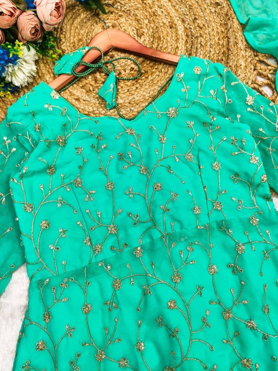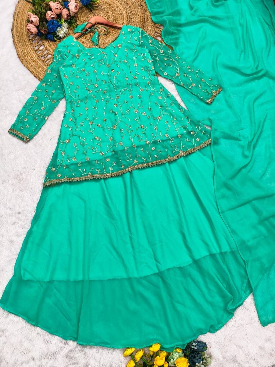 Step into a world of elegance with this stunning Georgette Embroidered Dress, designed to be both stylish and comfortable. The intricate embroidery all over the top is a masterpiece, with thread and sequin detailing that brings out the beauty of the dress. Its smooth, lightweight Georgette fabric offers an effortless flow, making it a perfect choice for both formal and casual occasions.