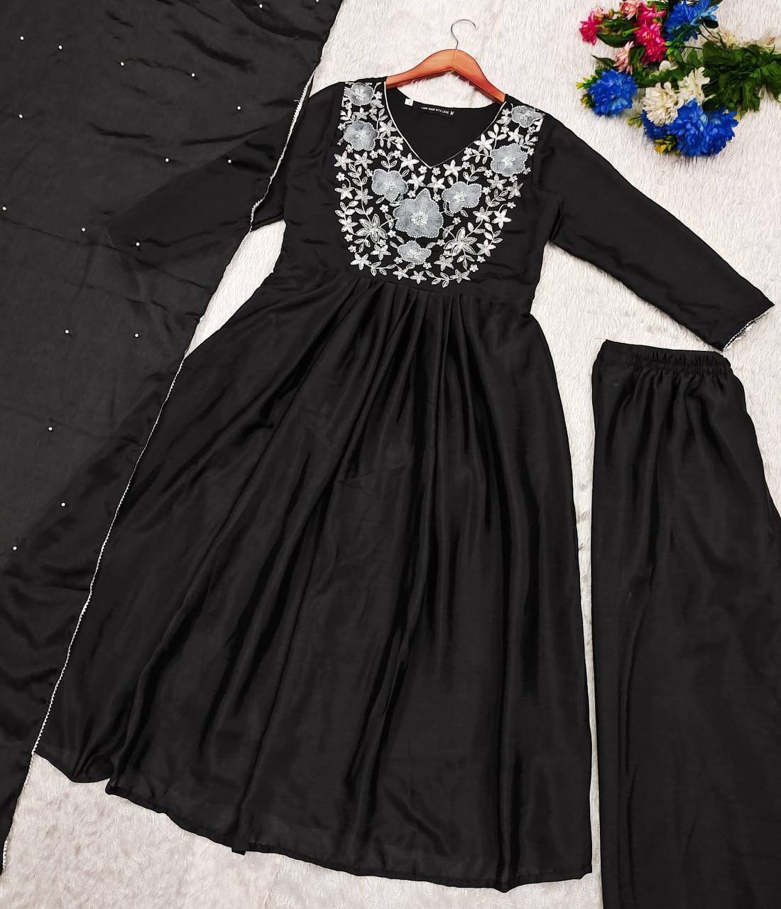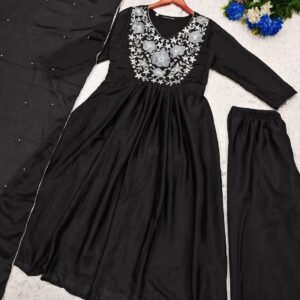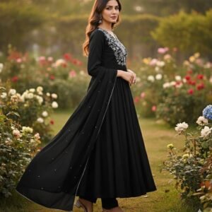 Step into elegance with this Midnight Black Anarkali, adorned with intricate thread and zari embroidery — perfect for evening events and festive glam.