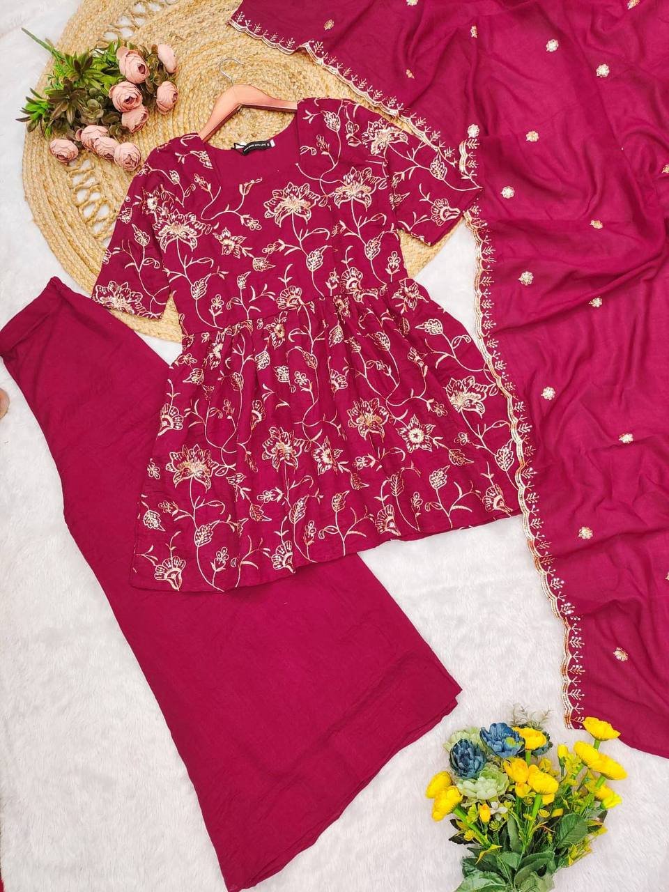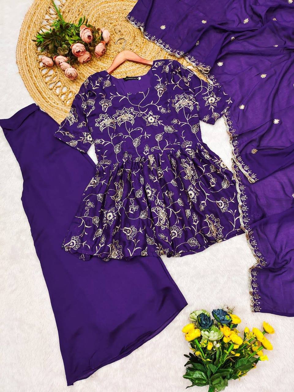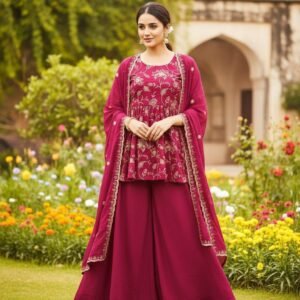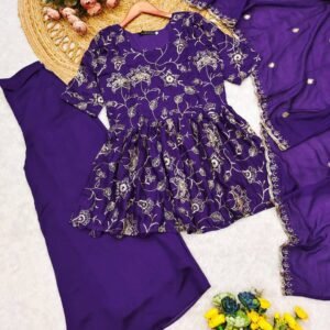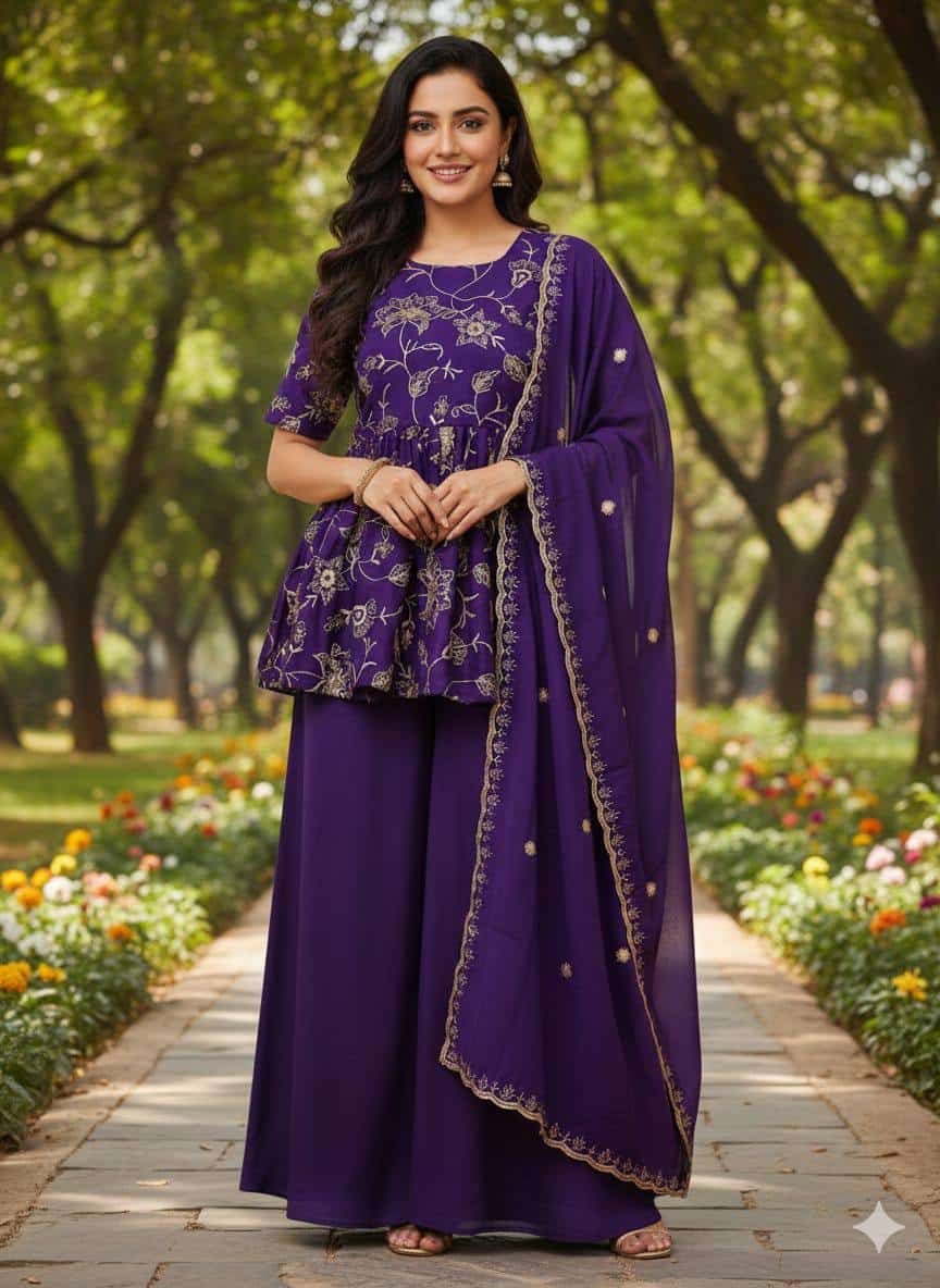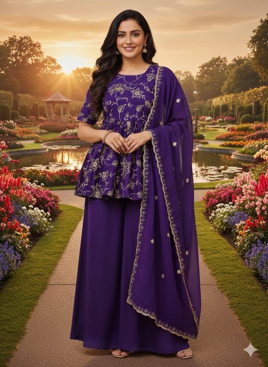 Elevate your style with this luxurious Vichitra Silk Peplum Set. Featuring exquisite embroidery on the kurta and a sleek plain palazzo, it’s the perfect blend of elegance and comfort for any special occasion.