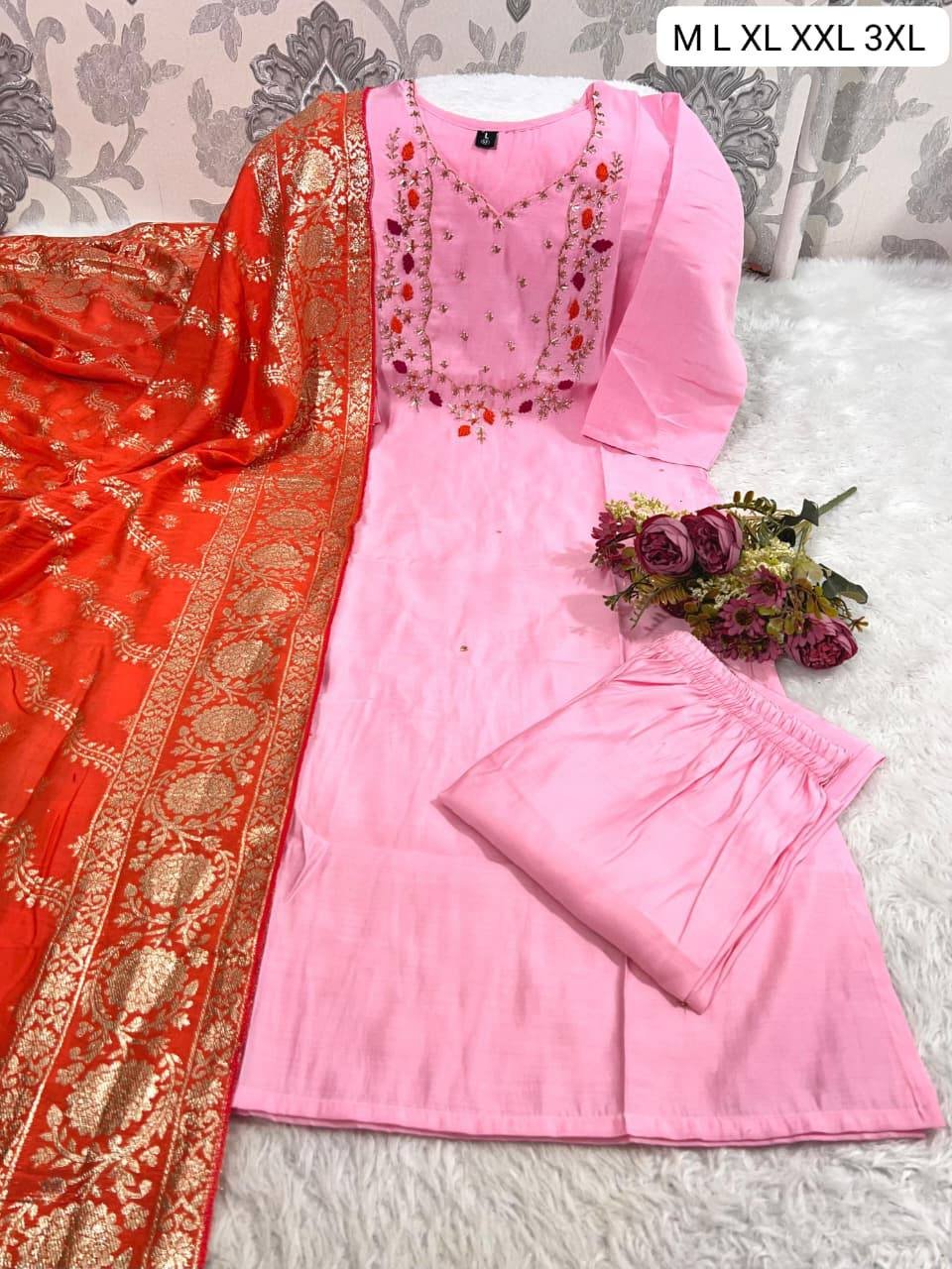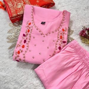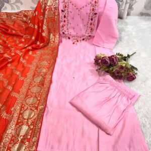 Exude grace and sophistication with our Pink Elegance Roman Silk Suit Set. Crafted from premium Roman silk, the kurti features exquisite handwork detailing that enhances its luxurious charm. Paired with matching silk pants and a beautiful heavy jacquard dupatta adorned with latkan tassels (2.20 m), this ensemble radiates festive opulence.