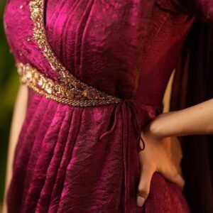 Step into effortless elegance with our Unique Style Pre-Draped Saree-Anarkali, crafted from Vichitra Silk and Sparkling Georgette. This party-ready ensemble features beautiful thread embroidery on the blouse, blending traditional grace with a contemporary twist. With its pre-draped design, short sleeves, and a flattering 50″ length, you’re all set to steal the spotlight at any celebration