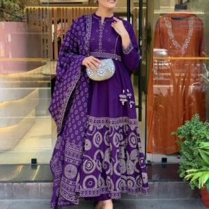 The gown’s 45+ inch kurti length and 38 inch bottom length provide a flattering drape and comfortable fit, making it ideal for festive occasions, celebrations, or family gatherings. The breathable muslin fabric ensures comfort throughout the day while maintaining a luxurious feel.