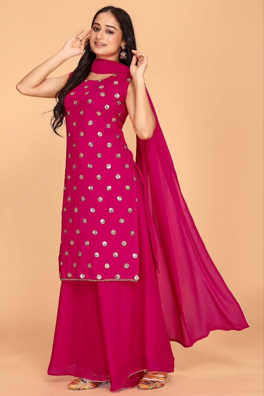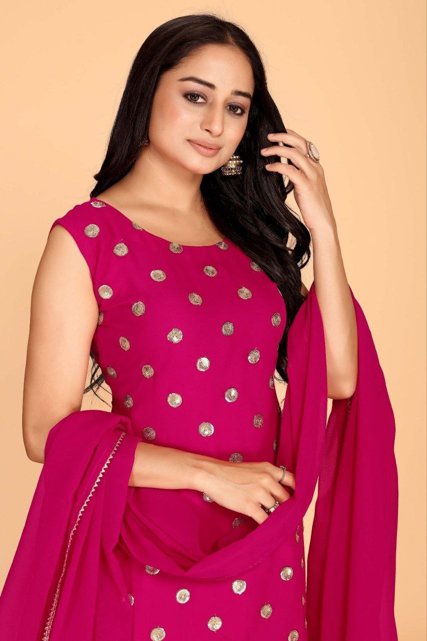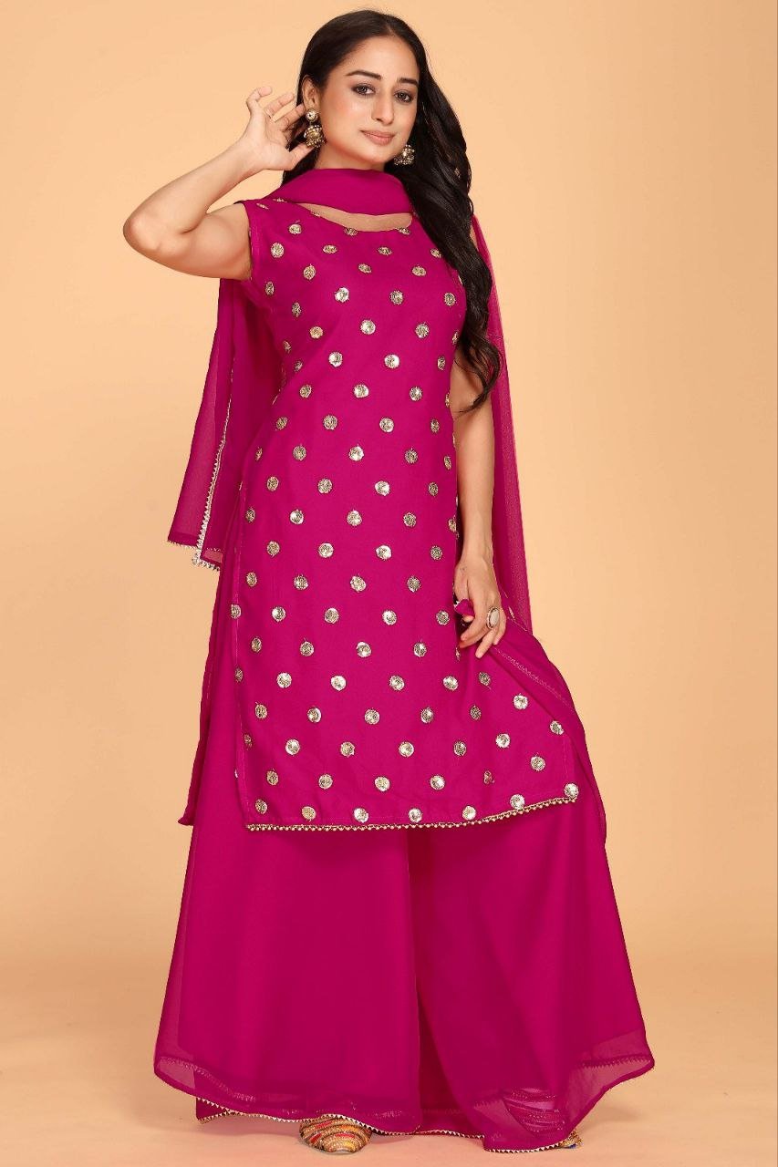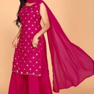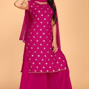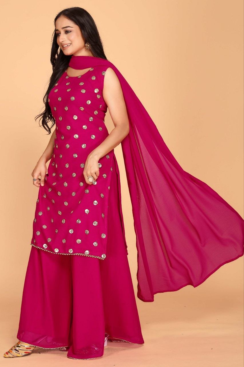Chic magenta sequin georgette plazzo set with matching dupatta — the perfect blend of sparkle, comfort, and festive elegance.