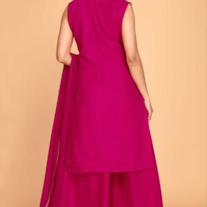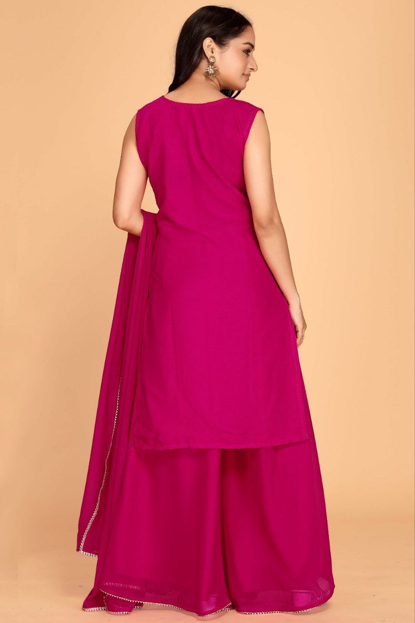 Step into elegance with this Radiant Magenta Georgette Plazzo Set, crafted to turn every occasion into a style statement. The top features a rich magenta hue adorned with delicate sequin embroidery, paired with a flowy georgette plazzo lined with soft cotton for all-day comfort. The look is completed with a matching magenta georgette dupatta featuring a subtle lace border, adding a graceful touch.