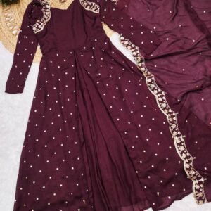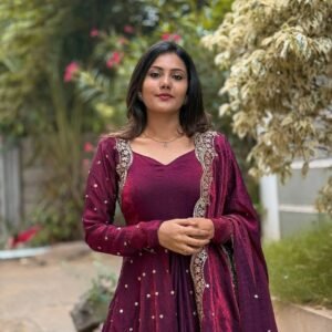 Unveiling our stunning Anarkali set in a radiant Wine colour, designed to make you the center of attention at any wedding or celebration. This elegant ensemble is crafted from Vichitra Silk, a fabric known for its soft texture and subtle shine—bringing an effortlessly rich and regal feel.