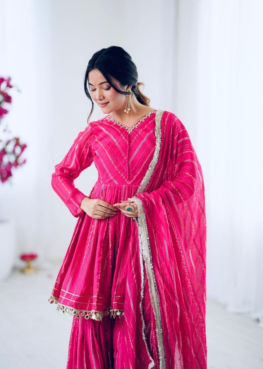 Stunning Mal Chanderi 3‑piece set with mirror handwork and full flare sharara — elegance redefined.