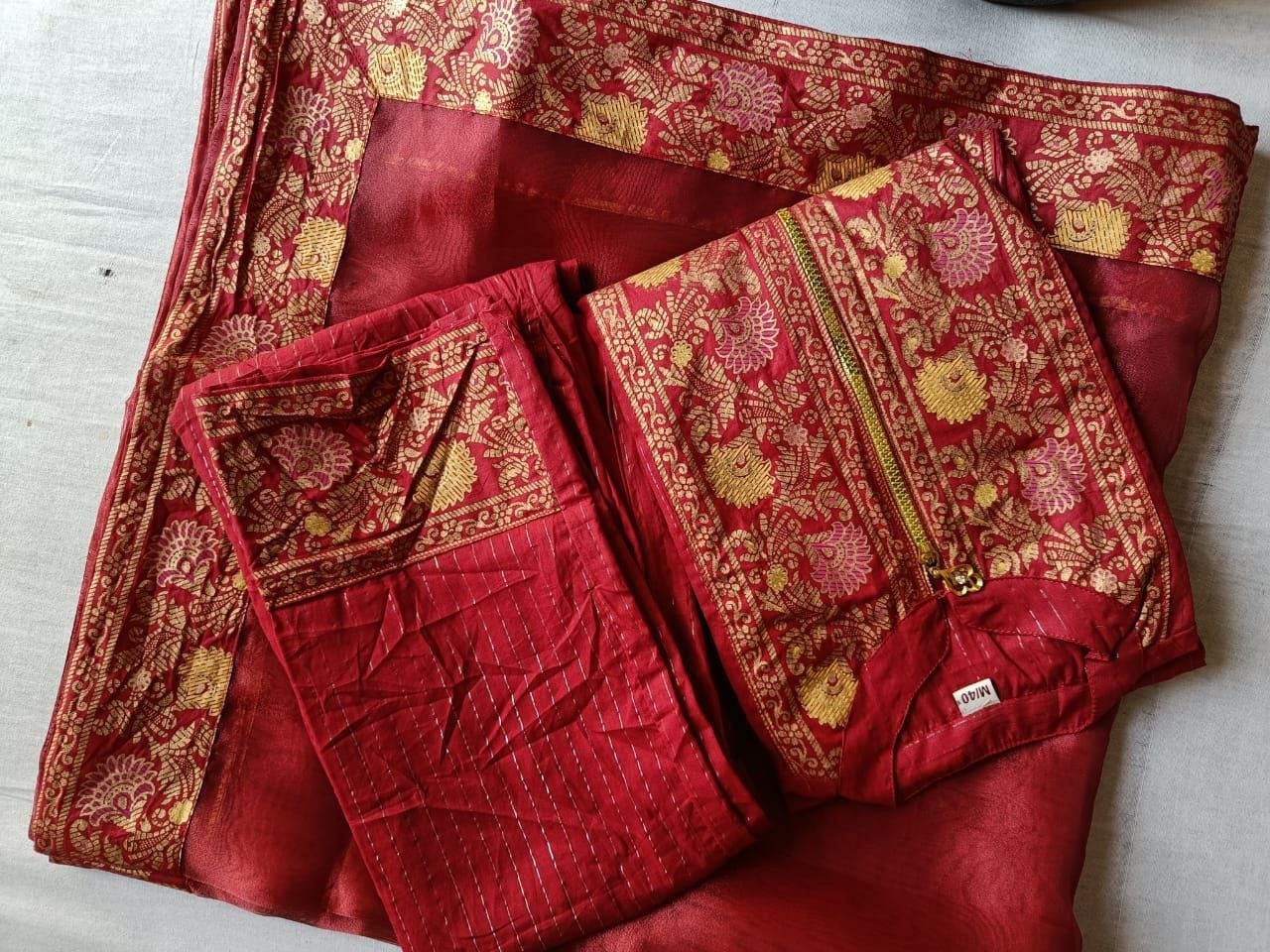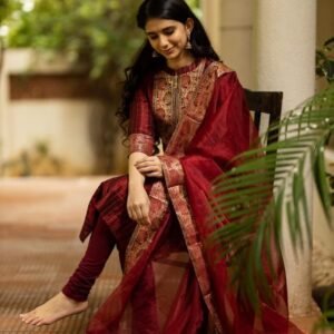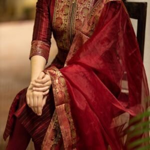 The rich red hue of the kurta is enhanced with delicate lurex threads, adding a subtle shimmer that catches the light, ensuring you stand out with effortless grace. Paired with sleek straight pants and a beautiful organza dupatta that drapes flawlessly, this outfit exudes elegance and luxury.