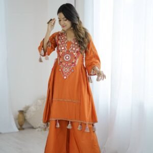 Perfect for casual celebrations, cultural events, or day gatherings — this ensemble captures the spirit of modern ethnic elegance. Its bright orange hue and exquisite craftsmanship make it a radiant style statement.