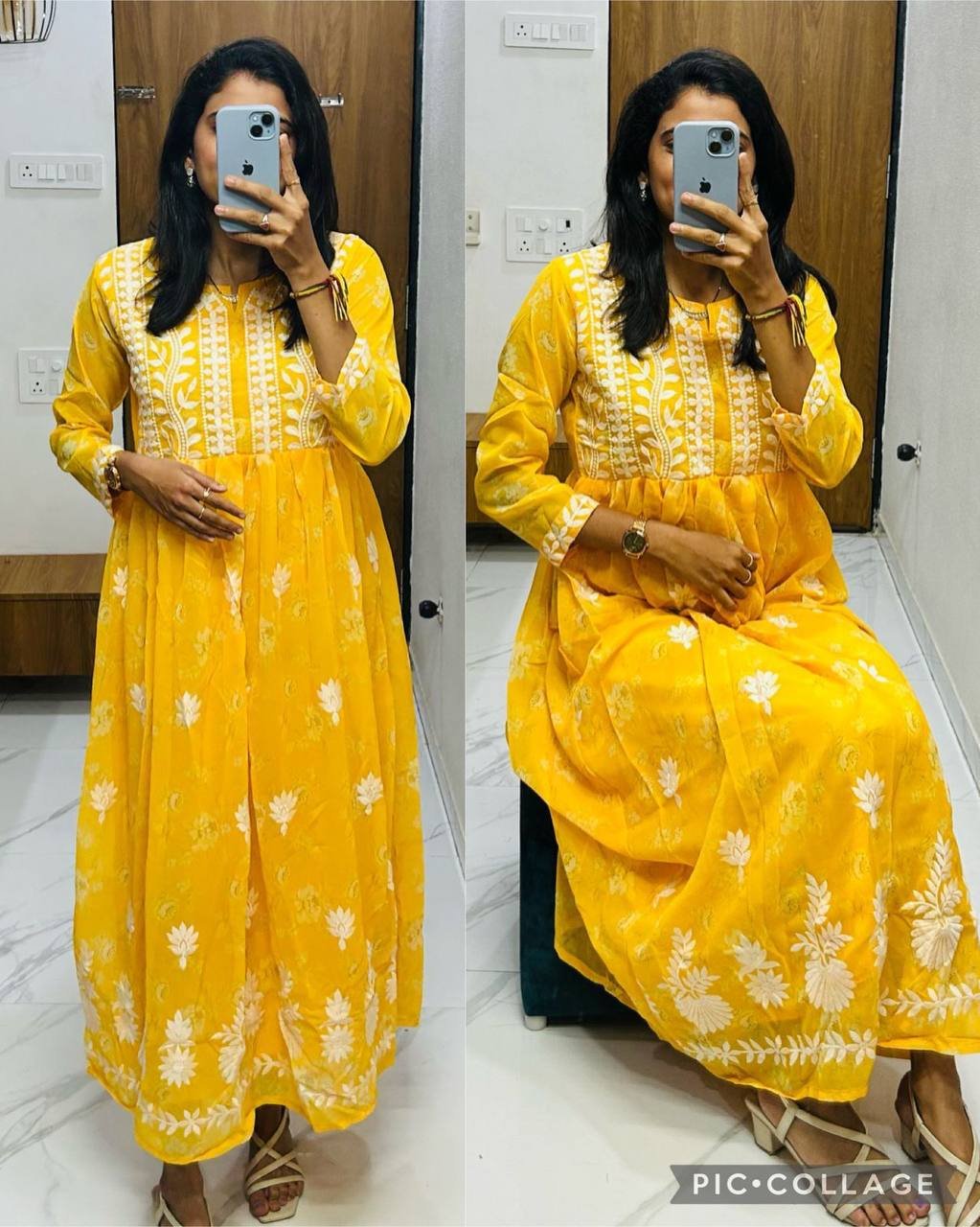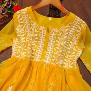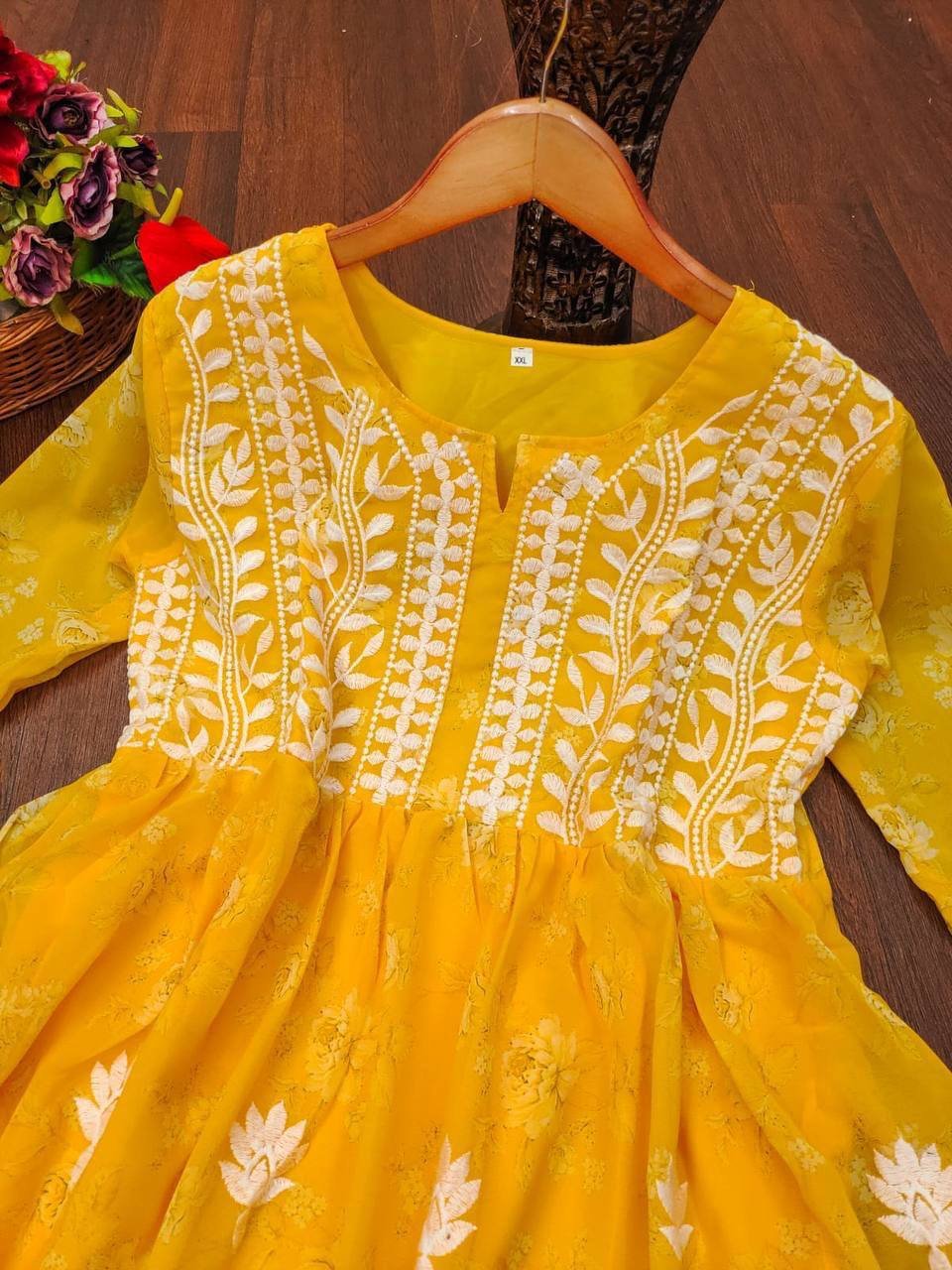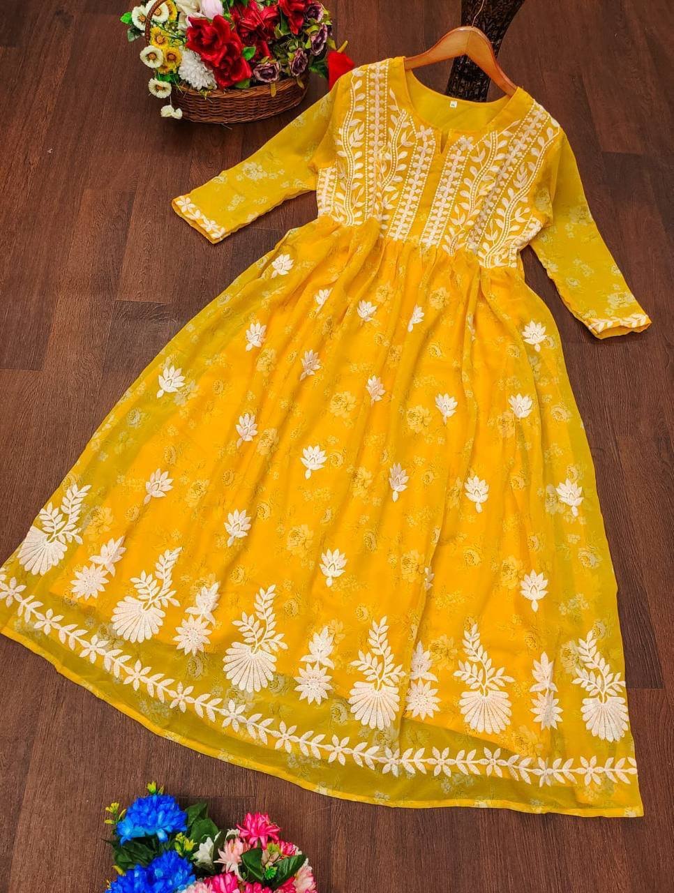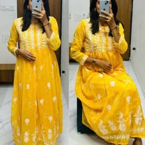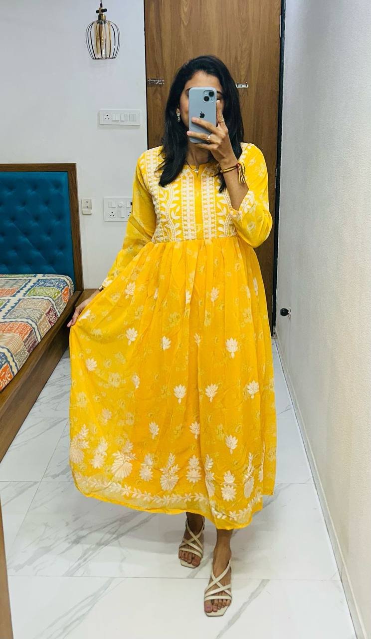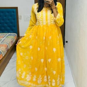 Grace meets tradition in Lucknawi Chikankari Gown — a stunning georgette ensemble featuring delicate embroidery on printed fabric. Perfect for festive occasions, parties, and elegant everyday wear.